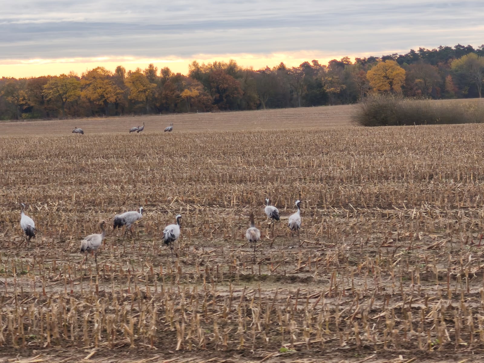 Im Drömling fühlen sich auch nordische Gänse und Kraniche sehr wohl. Sie haben mit einer 40 ha großen Flachwasserzone, die als Ausgleichs- und Ersatzmaßnahme für den Ausbau des Mittellandkanals Anfang der 2000er Jahre angelegt wurde, einen guten Rastplatz. Hier konnten die Drömlingsbesucher Augen- und Ohrenzeuge vom imposanten Morgenstart der Vögel sein, die in Formationen über die Köpfe der Reisenden des BN hinwegzogen. Besonders von den majestätischen Kranichen, die sich im gesamten Drömling tagsüber auf Feldern und nachts in der Flachwasserzone aufhalten, waren alle beeindruckt. Über 40 Kranichpaare brüten im Drömling und bleiben zum Teil ganzjährig im Biosphärenreservat.